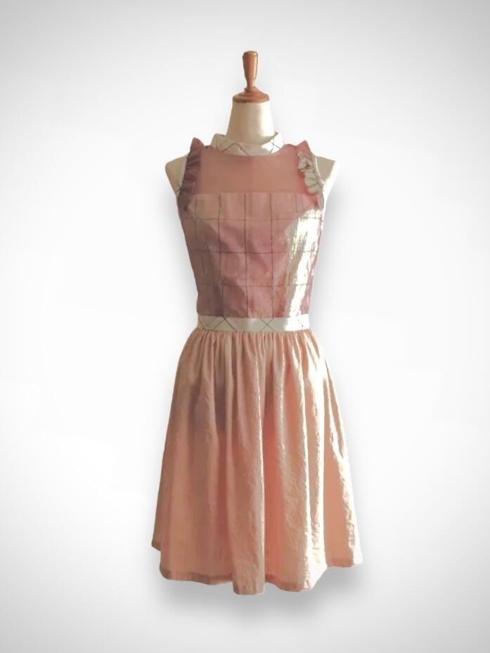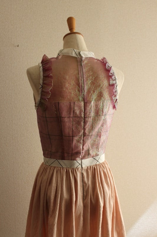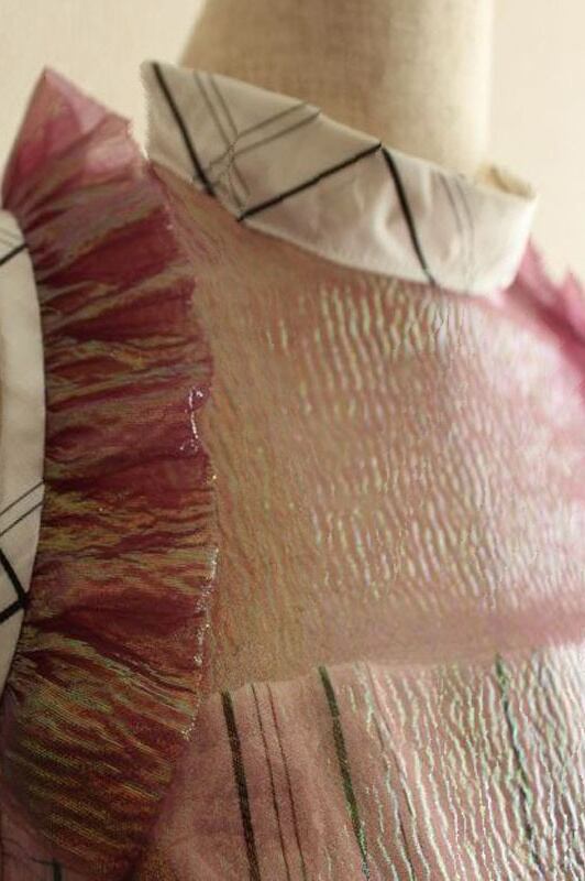 格子柄とホログラムチュールのミスマッチに光沢とネップのあるスカートを合わせる異素材ミックス、程よいシースルーで上品にまとまったデザインです。