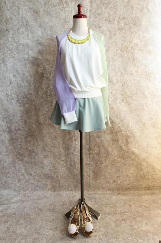 袖がオーガンジーのトレーナーとフレアーミニスカートのセット。