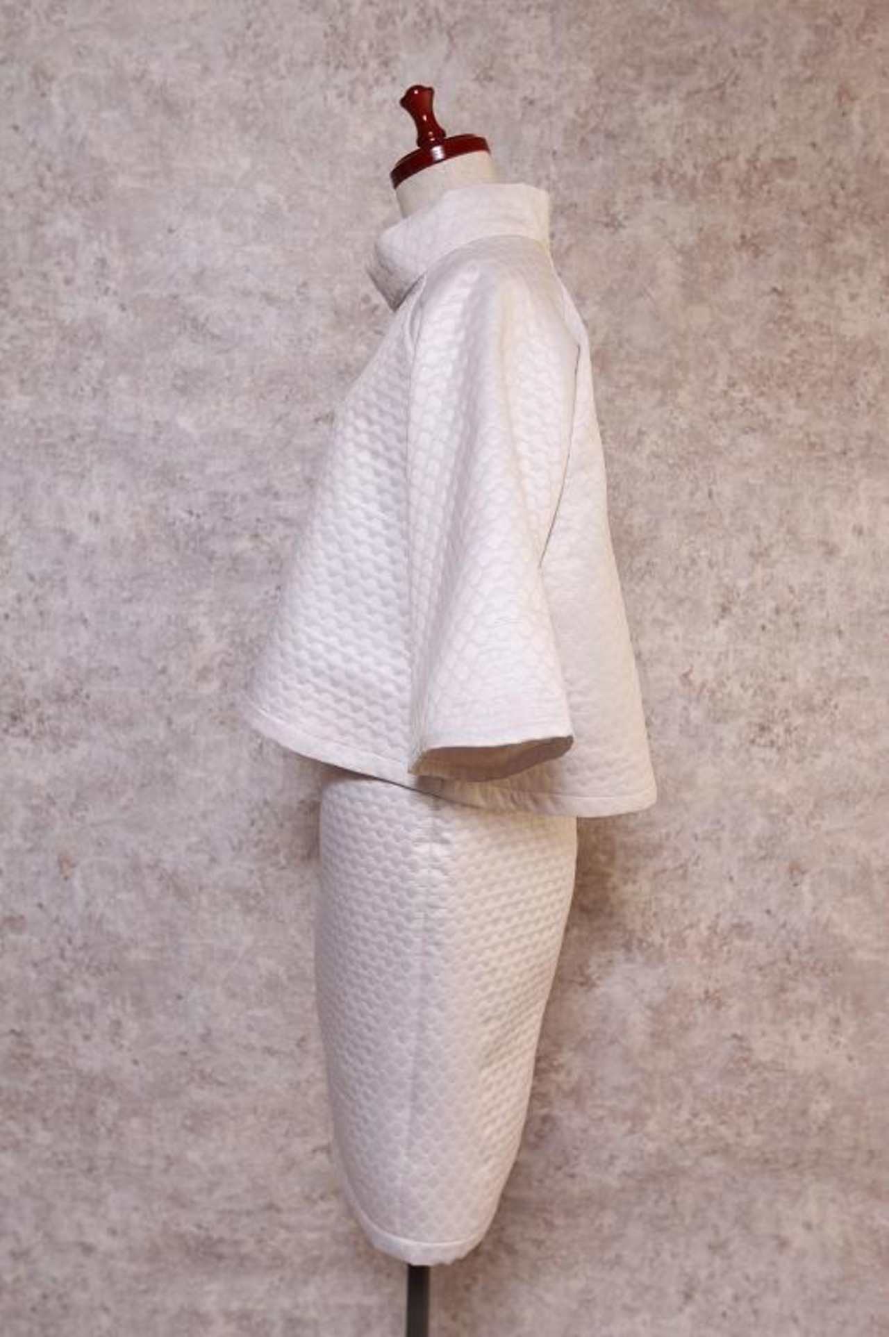 光沢のある厚手のジャガード生地のスーツです。少し大きめのシルエットになります。