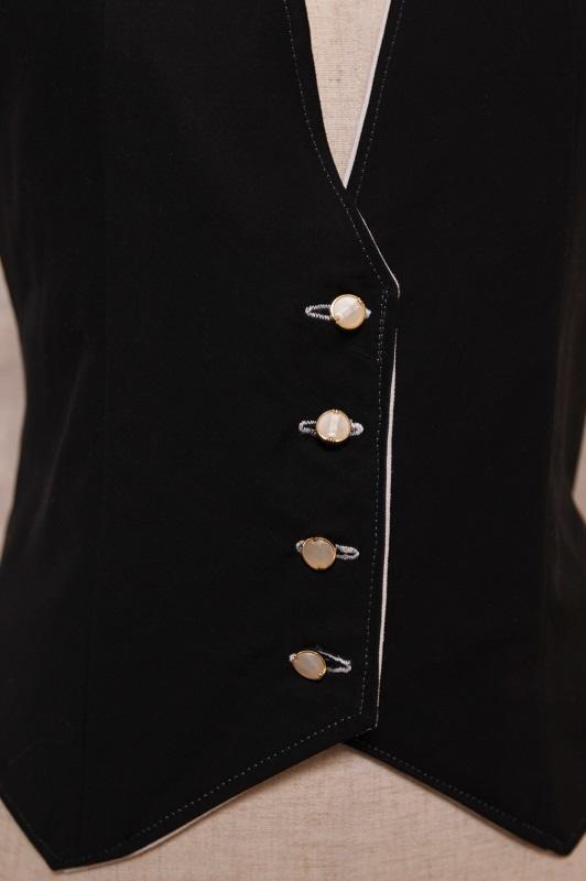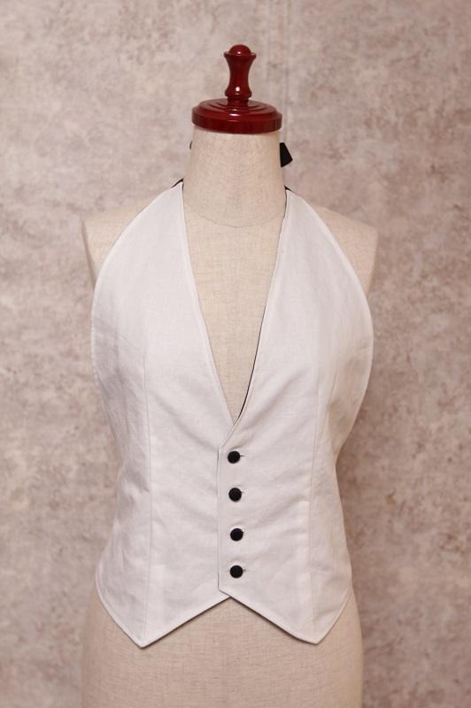 白の麻素材と黒のポリエステルのリバーシブルジレ。