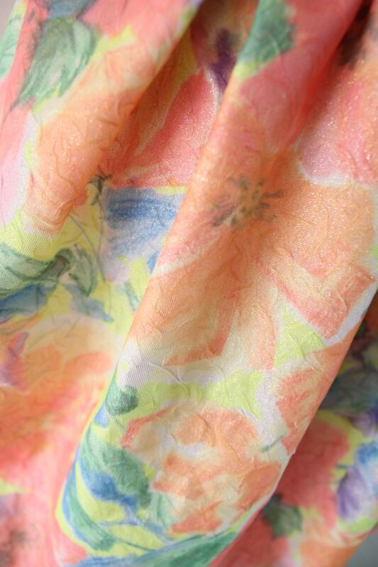 パリコレで見かけた明るい色のフラワープリントのようで魅かれた布です。